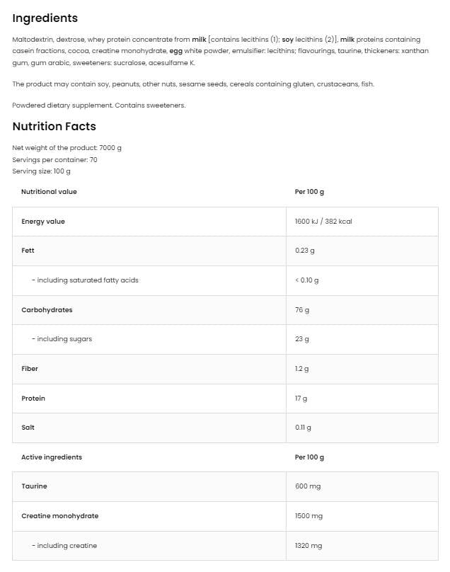 Anabolic Gainer este o formulă puternică concepută pentru persoanele care doresc să-și crească masa musculară și să-și îmbunătățească performanța în timpul antrenamentului. Compoziția sa include creatină și taurină, care sunt cunoscute pentru efectele lor benefice asupra rezistenței fizice, forței și recuperării. Creatina ajută la creșterea masei musculare și îmbunătățește performanța atletică, în timp ce taurina joacă un rol important în metabolismul energetic și în reglarea echilibrului electrolitic din organism.