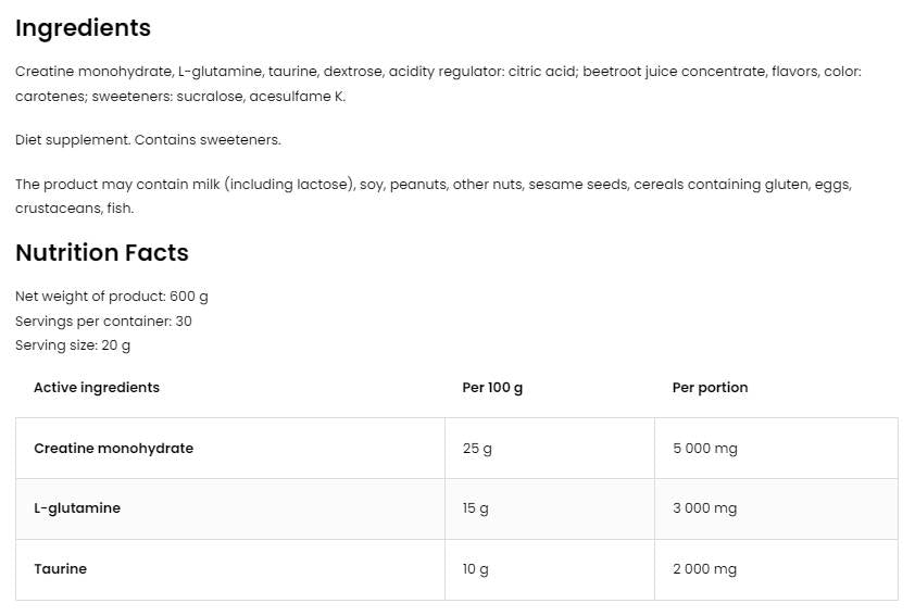 Cercetările științifice arată că acțiunea combinată a acestor ingrediente poate duce la îmbunătățiri semnificative ale performanței atletice și a recuperării fizice. De exemplu, creatina este legată de creșterea forței și dimensiunii musculare, în timp ce glutamina joacă rolul de sursă primară de energie pentru celulele musculare, mai ales după antrenamente intense. Taurina este cunoscută pentru proprietățile sale antioxidante și capacitatea de a îmbunătăți performanța fizică generală.