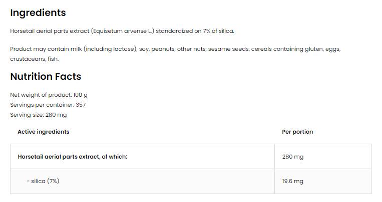 Extractul de coada-calului este bogat în minerale benefice și antioxidanți care oferă numeroase beneficii pentru sănătate. Consumul acestui produs poate îmbunătăți sănătatea părului și a unghiilor, deoarece este cunoscut pentru conținutul său ridicat de silice, care este important pentru creșterea și rezistența lor. În plus, coada-calului poate ajuta la pierderea în greutate prin stimularea metabolismului și reducerea retenției de apă în organism. Cercetările științifice arată că coada-calului are proprietăți antiinflamatorii care ajută la ameliorarea durerilor articulare și la îmbunătățirea flexibilității țesuturilor conjunctive. De asemenea, extractul de coada-calului actioneaza ca un diuretic natural, ajutand la curatarea organismului si la reducerea umflaturii. În plus, conține antioxidanți care luptă împotriva radicalilor liberi și pot încetini procesul de îmbătrânire a pielii. Este important de mentionat ca produsul nu este potrivit pentru consum de catre gravide sau persoane cu probleme renale. Înainte de utilizare, se recomandă consultarea unui medic. Pentru cele mai accesibile cumpărături pentru extract de coada-calului, Feel You oferă prețuri competitive și produse de calitate. În magazinul nostru poți fi sigur că obții cea mai bună calitate la un preț rezonabil! **Vă rugăm să vedeți a doua fotografie a produsului pentru toate ingredientele produsului.**