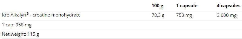 Kre-Alkalyn este de peste 10 ori mai eficient decât creatina monohidrat și vă va permite să luați maximum de creatină în cantitate de 2-3g pe zi fără probleme de stomac. În plus, cu Kre-Alkalyn se evită acumularea de apă în organism. Celelalte avantaje ale sale sunt eliminarea așa-numitului n. perioada de acumulare, tipică altor forme de creatină, precum și tamponarea acumulării de acid lactic în mușchi și neutralizarea efectului neplăcut al durerilor musculare.