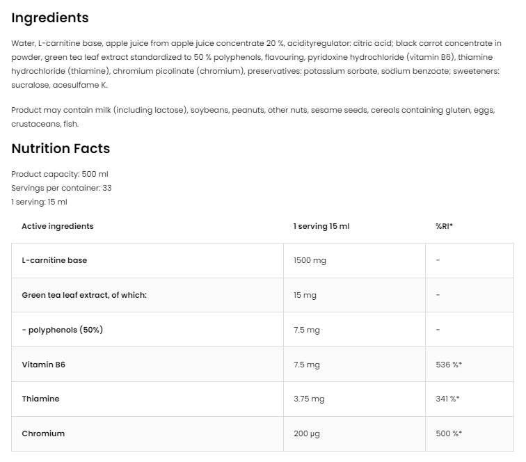 L-Carnitine Liquid este un produs unic care combină proprietățile puternice ale L-carnitinei, ceaiului verde și cromului pentru a vă oferi o soluție eficientă pentru pierderea în greutate și îmbunătățirea rezistenței fizice. L-carnitina joacă un rol cheie în transportul acizilor grași către mitocondrii, unde sunt arse pentru energie. Ceaiul verde este cunoscut pentru proprietățile sale antioxidante, care ajută la combaterea radicalilor liberi, în timp ce cromul ajută la reglarea nivelului de zahăr din sânge, care este deosebit de important pentru controlul apetitului. Cercetările științifice susțin beneficiile L-carnitinei, demonstrând că poate crește arderea grăsimilor și poate îmbunătăți performanța fizică. Ceaiul verde este, de asemenea, legat de creșterea metabolismului și pierderea în greutate, iar cromul poate reduce pofta de mâncare, în special pentru substanțele zaharoase. Este important de reținut că persoanele cu afecțiuni medicale cunoscute sau cei care iau medicamente trebuie să consulte un medic înainte de a utiliza produsul. Nu este recomandat femeilor însărcinate sau care alăptează. Pentru cea mai avantajoasă experiență de cumpărături, Feel You oferă prețuri excelente și produse de calitate care îndeplinesc standarde înalte de siguranță și eficacitate. Cumpărați cu încredere și profitați de oferte speciale. **Nu uitați să vă uitați la a doua fotografie a produsului pentru toate ingredientele produsului!**
