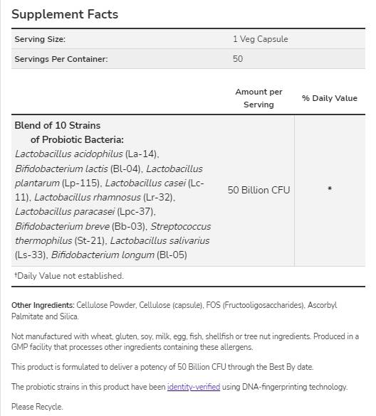 Probiotic-10 50 Billion este o formulă puternică care combină 10 tulpini diferite de probiotice, oferind 50 de miliarde de culturi probiotice active per porție. Aceste probiotice joacă un rol cheie în menținerea florei intestinale sănătoase, care este esențială pentru funcționarea normală a sănătății noastre digestive.