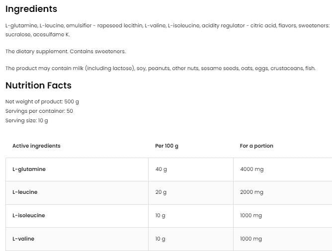 Raportul 1:1 de BCAA și glutamină îmbunătățește recuperarea musculară în timpul și după antrenamentele de intensitate ridicată, prevenind degradarea musculară.