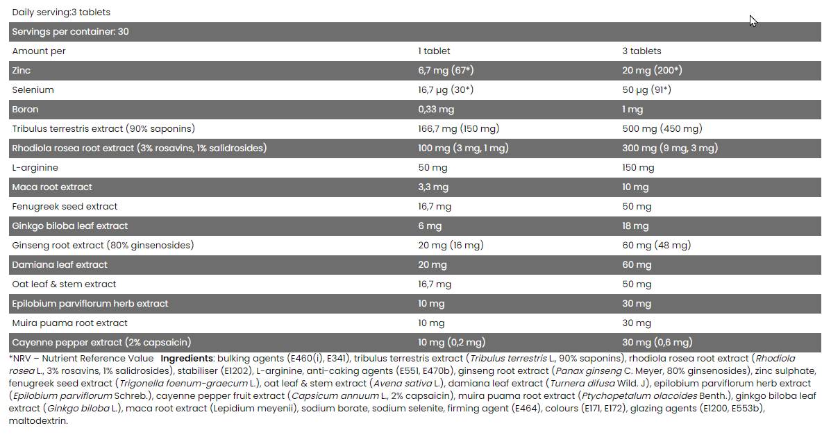 Reglarea cortizolului - reducerea stresului si adaptarea organismului sunt un element important in mentinerea nivelului ridicat de testosteron. Complexul care are grijă de acest lucru include puternicele plante adaptogene Rhodiola, Ginseng și Maca;
