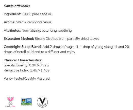 Avertismente: Nu utilizați ulei de salvie dacă sunteți însărcinată sau alăptați. În caz de intoleranță individuală la ingrediente, este necesar să consultați un medic înainte de utilizare.