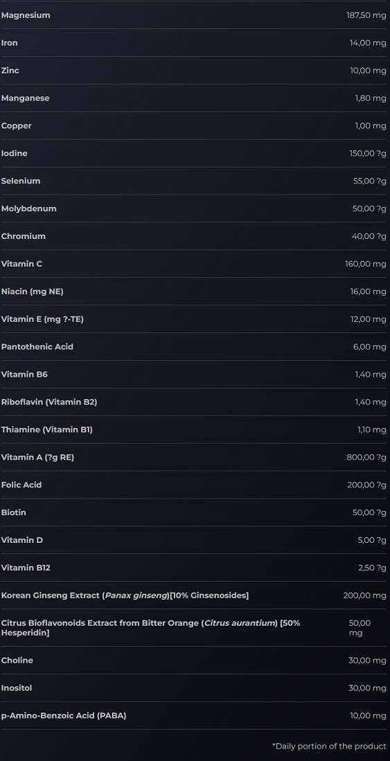 COMPOZIŢIE: Complex mineral esențial [oxid de magneziu; carbonat de magneziu; fumarat feros; maltodextrine; sulfat de zinc; sulfat de mangan; sulfat de cupru; iodură de potasiu; clorură de crom; molibdat de sodiu; selenat de sodiu]; Amplificatori metabolici [extract de ginseng coreean (Panax ginseng) [10% ginsenozide]; extract de bioflavonoid de citrice din portocală amară (Citrus aurantium) [50% hesperidină]; bitartrat de colină; inozitol; acid p-aminobenzoic (PABA)]; Formula de vitamine [vit. C (acid L-ascorbic); niacină (nicotinamidă); vit. E (acetat de DL-alfa-tocoferil); acid pantotenic (D-pantotenat de calciu); vit. B6 (clorhidrat de piridoxină); riboflavină; tiamină (mononitrat de tiamină); vit. A (acetat de retinil); acid folic (acid pteroilmonoglutamic); biotină (D-biotină); vit. D (colecalciferol); vit. B12 (cianocobalamină)]; învelișul capsulei (gelatină; coloranți – dioxid de titan, oxizi și hidroxizi de fier, albastru patent V); agent antiaglomerant – săruri de magneziu ale acizilor grași.