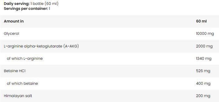 Compoziţie: apă, suc de mere din suc de mere concentrat (20%), glicerol, L-arginină alfa-ketoglutarat (A-AKG), betaină HCl, sare de Himalaya, acid (acid citric), arome, îndulcitori (acesulfam K, sucraloză, neotam), conservanți (sorbat de potasiu, bentodextrin),
