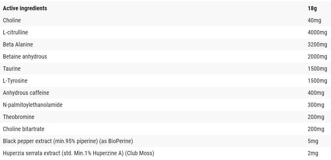 Colina: Reduce nivelul de colesterol rău, întărește sănătatea bilei și are un efect benefic asupra sistemului nervos central. De asemenea, acest ingredient crește producția de hormon de creștere, crește rezistența în timpul antrenamentelor de mare intensitate și protejează masa musculară de deteriorare.