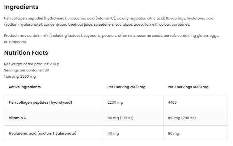 Colagen marin și pulbere de acid hialuronic cu vitamina C este un supliment alimentar care contine colagen marin, acid hialuronic și vitamina C.