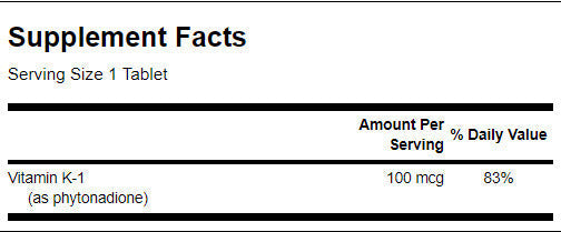 Vitamina K-1 de la Swanson este o modalitate sigură de a vă furniza organismului acest nutrient vital. Vitamina K-1 promovează sănătatea oaselor și a sângelui. Fiecare tabletă furnizează 100 mcg de vitamina K-1.