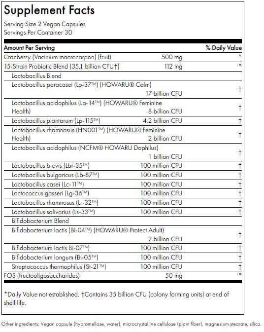 Fiecare doză de 2 capsule vegetale conține merișor și prebiotic FOS combinat cu 35 de miliarde de bacterii benefice