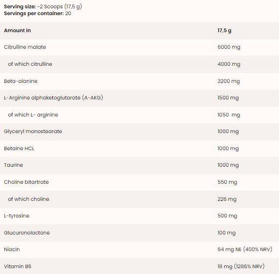 Conținutul de 6000 mg citrulină malat poate ajuta la îmbunătățirea performanței fizice și la accelerarea recuperării. 3200 mg Beta-Alanina este cunoscut pentru încetinirea acumulării de acid lactic, reducerea oboselii și creșterea performanței în timpul antrenamentelor intense. 1500 mg L-arginina (A-AKG) este un stimulator puternic care crește circulația sângelui și furnizează oxigen mușchilor.