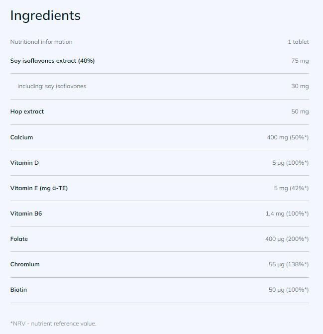 Ingrediente: carbonat de calciu, extract de izoflavone de soia, celuloză microcristalină – umplutură, extract de hamei comun (Humulus lupulus L.), amidon de cartofi, acetat de DL-alfa-tocoferil – vitamina E, stearat de magneziu – agent antiaglomerant, colecalciferol – vitamina D, clorhidrat de piridoxină – clorhidrat de piridoxină – clorhidrat de piridoxină – vitamina B6, clorhidrat de piridoxină, clorhidrat de ploril-III (vitamina B6), , alcool polivinilic, polietilen glicol, talc, silicat de potasiu aluminiu, polisorbat – agenți de glazură, dioxid de titan – colorant.