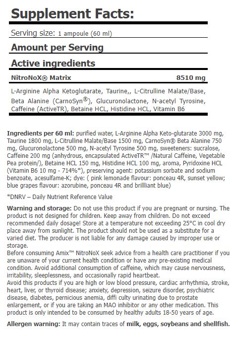 Vă rugăm să vedeți a doua fotografie a produsului pentru lista completă de ingrediente. AMIX Nitro Nox® Shot Box.