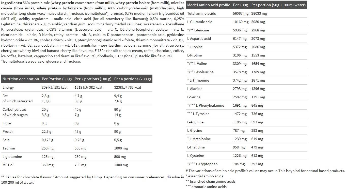 O combinație de proteine ​​(concentrat de proteine ​​din zer, cazeină micelară, izolat de proteine ​​din zer și hidrolizat de proteine ​​​​din zer) și carbohidrați într-un raport de 50:50.