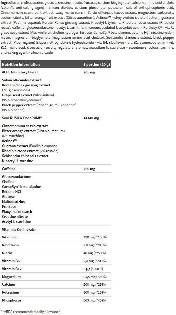 În Soul Ripper™ Sunt selectate ingrediente care nu provoacă o creștere a excitabilității musculare și sporesc eficacitatea contracțiilor musculare la începutul antrenamentului, pentru că oricum ai multă energie la început, așa că nu are rost să accelerezi ritmul de utilizare a rezervelor de energie care vor fi necesare mai târziu în timpul antrenamentului.